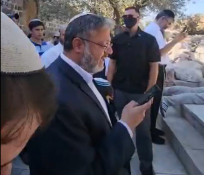 بعد أن قاد صلاة شاحاريت (فجر)، وقف بن غفير أمام المزار، مطالبًا إسرائيل بفرض “السيادة والحكم” على الحرم القدسي.