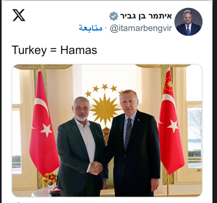 ونشره بن غفير عبر حسابه على منصة “إكس” صورة تجمع الرئيس التركي رجب طيب أردوغان مع إسماعيل هنية، رئيس المكتب السياسي لحماس الذي اغتيل في طهران، وكتب “Turkey = Hamas” (تركيا = حماس)، في إشارة إلى اتهامه أنقرة بدعم الحركة.