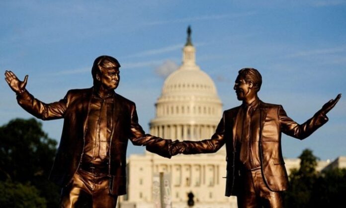أُعيد، الخميس، إلى موقعه الأصلي في متنزه “ناشونال مول” في واشنطن، على بُعد خطوات من مبنى الكابيتول، تمثالٌ ساخر يُمثّل الرئيس الأمريكي دونالد ترامب ورجل الأعمال الراحل المُدان بارتكاب جرائم جنسية جيفري إبستين، وهما متشابكا الأيدي.