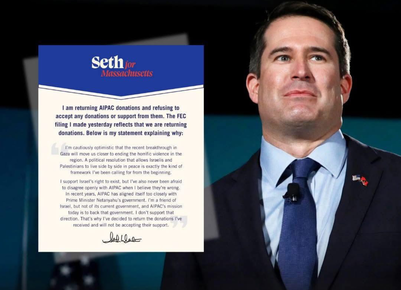 في خطوة نادرة في المشهد السياسي الأميركي، أعلن النائب الديمقراطي عن ولاية ماساتشوستس سيث مولتون أنه سيعيد جميع التبرعات التي تلقّاها من لجنة الشؤون العامة الأميركية الإسرائيلية (AIPAC) وسيتوقف عن قبول أي دعم منها مستقبلًا، احتجاجًا على دعمها الصريح لحكومة رئيس الوزراء الإسرائيلي بنيامين نتنياهو والحرب في غزة.