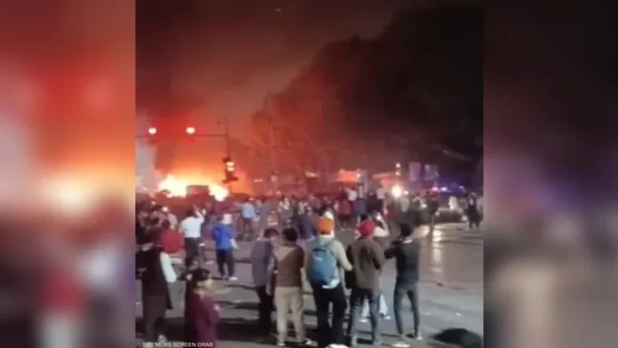 وفي مقاطع فيديو متداولة يمكن رؤية نيران ضخمة وسط تجمع العشرات.
