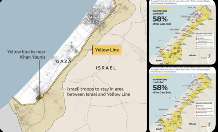 - الخط الأصفر: تمّ في إطار اتفاق وقف إطلاق النار بين إسرائيل وحماس تحديد خط حدودي مؤقت داخل غزة يُعرف بـ “الخط الأصفر”، يفصل بين المناطق الخاضعة لسيطرة إسرائيلية والمناطق التي يُفترض أن تُخضع لإدارة فلسطينية أو مدنية.