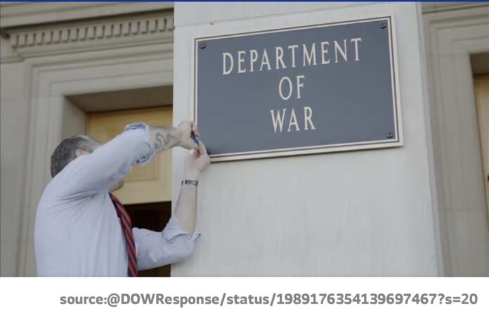 وظهرت مقاطع فيديو نُشرت على حسابات الوزارة على مواقع التواصل الاجتماعي، تُظهر وزير الدفاع بيت هيغسيث وهو يعلِّق شخصيا إحدى اللوحات البرونزية المكتوب عليها “وزارة الحرب”.