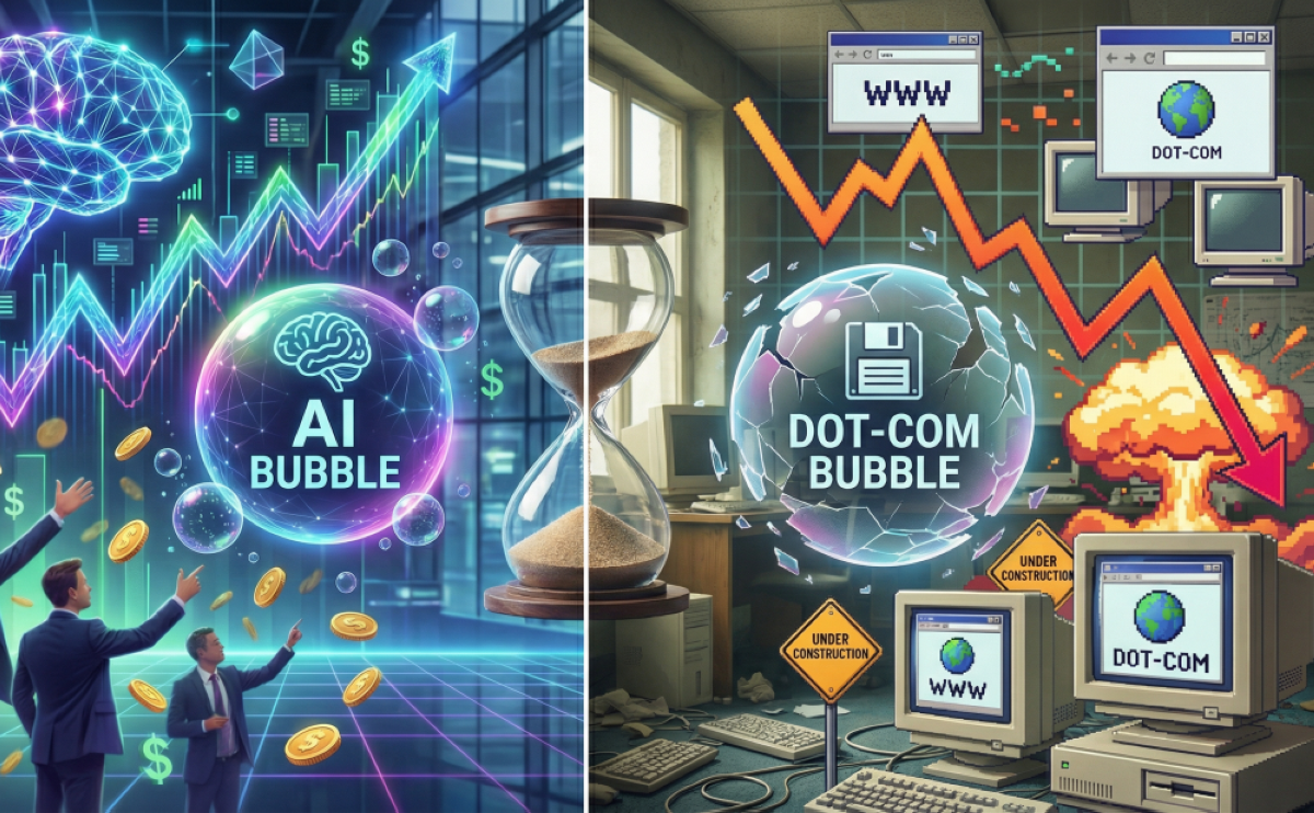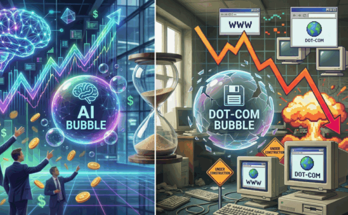 ويبدو شبح فقاعة دوت كوم مسيطراً على حالة الترقب في الأسواق العالمية حول الذكاء الاصطناعي، إلا أنه تظهر العديد من الاختلافات الجوهرية بين فورة الدوت كوم أواخر التسعينيات وبين مشهد الذكاء الاصطناعي اليوم، أحد أبرز الفوارق هو نوعية الشركات والاستثمارات المعنية، ففقاعة الدوت كوم تمتعت بانتشار أعداد هائلة من الشركات الناشئة ذات النماذج التجارية غير الواضحة (كثير منها لم يكن يحقق أرباحاً فعلية حينها)، وكانت التقييمات تعتمد على مؤشرات غير تقليدية مثل عدد الزوار أو «الزيارات» بدلاً من الإيرادات، أما طفرة الذكاء الاصطناعي الحالية، فتركزت إلى حد كبير في شركات تكنولوجيا عملاقة راسخة أو شركات بعتاد hardware أساسي مثل رقائق NVIDIA التي تقوم بضخ استثمارات هائلة في البنية التحتية الملموسة، إضافة إلى نموذج المدفوعات الحالي، والذي لا يتيح الذكاء الاصطناعي بكل أبعاده بشكل مجاني، وبالتالي فالعائد المادي كبير من الاشتراكات، التي تعد عائداً مادياً يعوض الخسارة ويوقف الذكاء الاصطناعي على أرض صلبة إلى حد بعيد، ففي حين تميزت حقبة الدوت كوم بارتفاعات خيالية دون مردود متوقع أو نظام مدفوعات يعوض مصاريف البنية التحتية.
