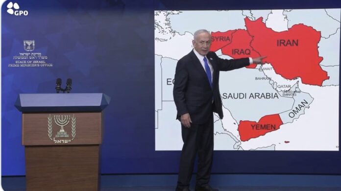 أثار رئيس الوزراء الإسرائيلي بنيامين نتنياهو موجة واسعة من الجدل بعدما عرض، في كلمة مصورة نشرت على حسابه بمنصة إكس، خريطة للشرق الأوسط ملوناً فيها خمس دول باللون الأحمر، في إشارة رمزية واضحة إلى تصنيفها ضمن دائرة الخصوم الرئيسيين لإسرائيل.