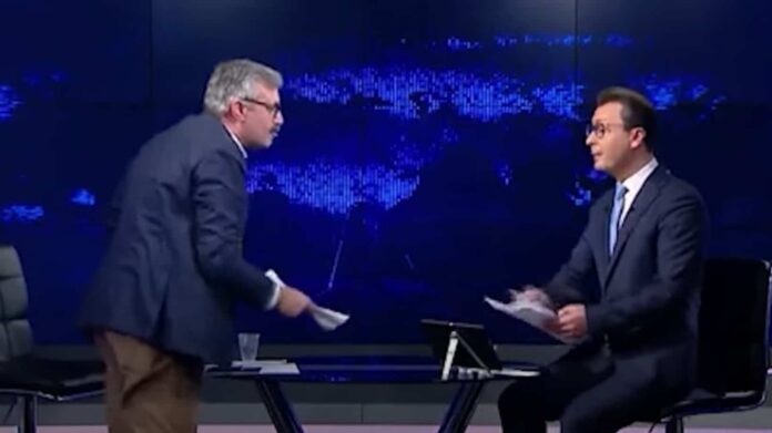 وقال الريحاوي “إما أن تناقش باحترام وأدب أو غادر الحلقة” ليقوم بعدها الضيف التركي بسحب أوراق المقدم من على الطاولة وتمزيقها ومغادرة الاستديو”.