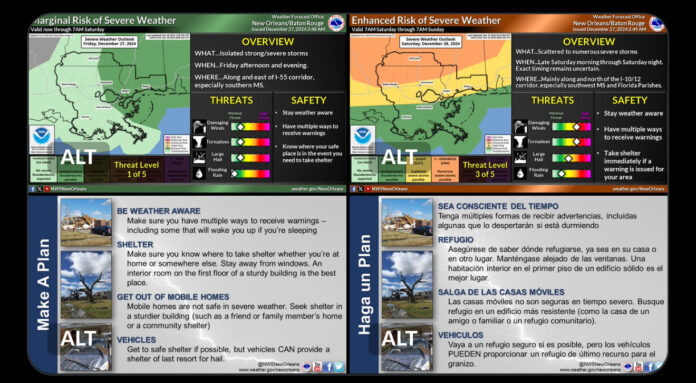 وقال مركز التنبؤ بالعواصف التابع للخدمة الوطنية للأرصاد الجوية إنه من المتوقع أن يبدأ طقسًا قارسًا من اليوم السبت ويستمر إلى نهاية الأسبوع، مع احتمال حدوث عواصف شديدة من شرق تكساس عبر وادي المسيسيبي الجنوبي إلى أجزاء من وادي تينيسي.