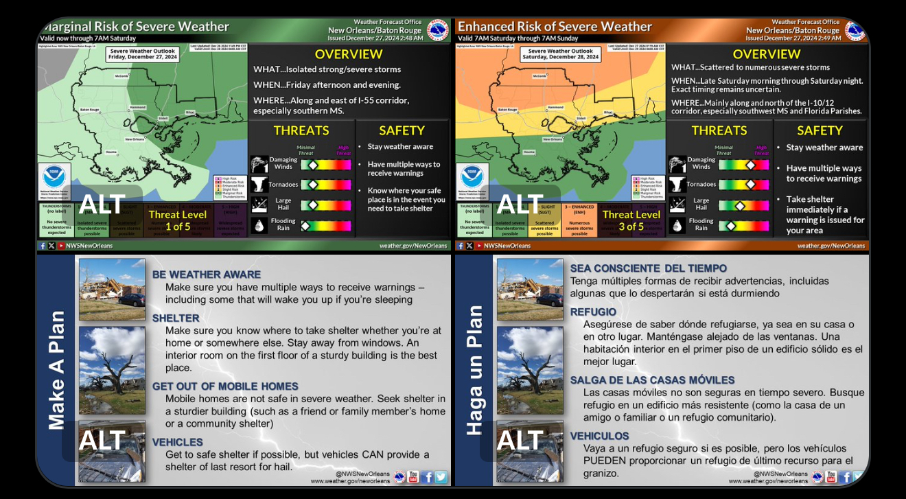 ووفقًا لشبكة سي إن إن ، قد تضرب المزيد من الأعاصير وتتساقط حبات البَرَد جنوب شرق لويزيانا ووسط ميسيسيبي، بما في ذلك العاصمة جاكسون، وغرب ألاباما.