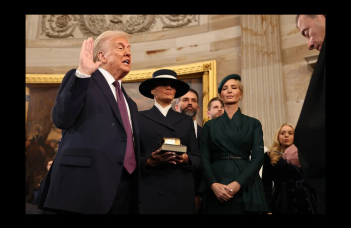 دونالد ترمب يقسم اليمين الدستورية رئيساً للولايات المتحدة في مبنى الكابيتول في العاصمة الأميركية واشنطن في 20 يناير 2025 (أ.ف.ب)