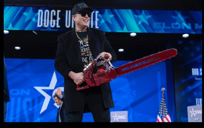 مرتديا نظارة شمسية، وقبعة سوداء تحمل شعار “لنجعل أميركا عظيمة مرة أخرى”، ظهر الملياردير إيلون ماسك وهو يلوح بـ “منشار كهربائي” في فعالية “مؤتمر العمل السياسي المحافظ” في ناشونال هاربور بولاية مريلاند.